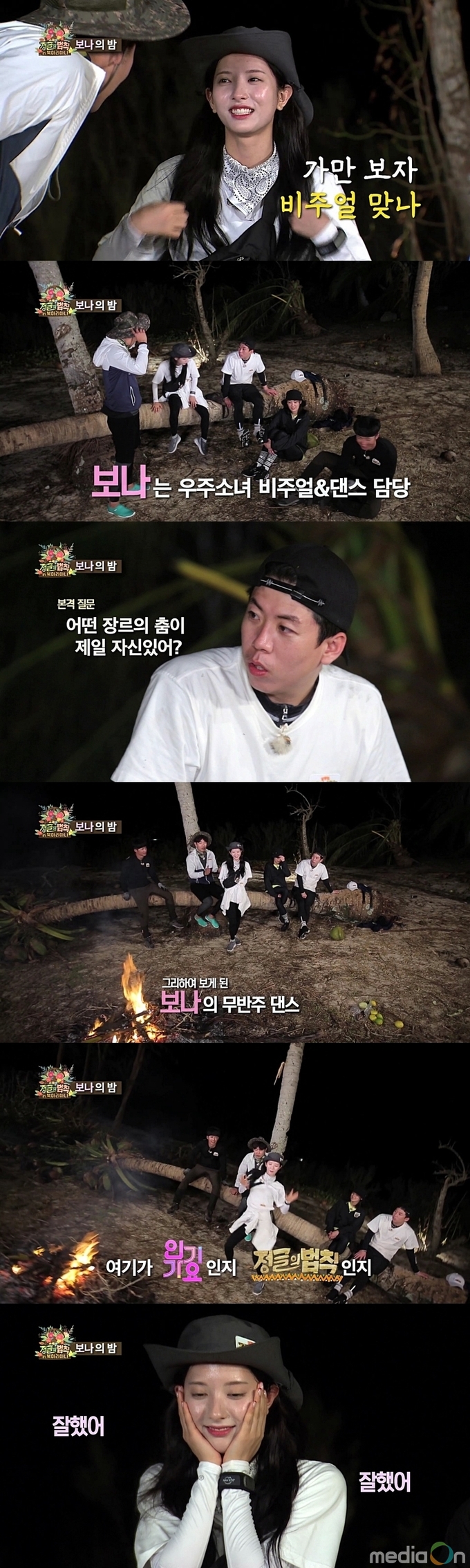 이어 보나가 자신의 포지션을 “춤”이라고 밝히자, 멤버들은 관심을 가지며 “보나 춤 보고싶다. 보여줘”라고 앞다퉈 말했다. 이종혁과 양세찬이 “편집으로 다 가능해. 음악 깔아줄게”라며 멍석을 깔자 보나는 정글 스테이지로 나섰다.