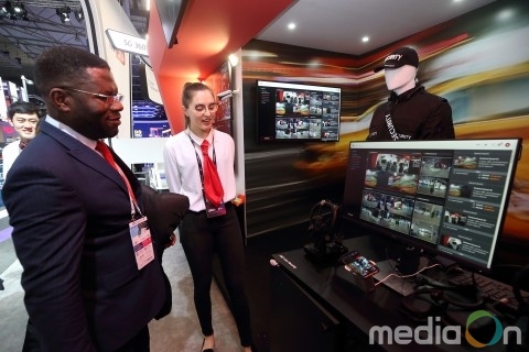 KT는 MWC 행사장에서 360도 서베일런스 서비스 관제와 안전장비 착용 검사 시연을 선보였다. 작업장에 출입하는 근로자의 안전모, 조끼, 장갑, 마스크 등 안전장비 착용 여부를 자동으로 확인하고 미착용 부위를 알려주는 인공지능 영상분석 기술을 관람객들이 직접 체험했다.
