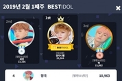 2019년 2월을 알리는 첫 번째 베스트아이돌 투표 결과가 공개됐다. 투표결과 강다니엘이 매주 새로운 기록을 경신하며 52주 연속 베스트아이돌로 선정되었다. 그 뒤를 이어 지민과 뷔가 2위, 3위를 지키고 있으며 2위부터 5위까지 모두 방탄소년단이 차트를 점령했다. 매주 1위를 점령하려는 치열한 투표가 계속되는 가운데 강다니엘 신드롬을 깨는 아이돌이 누가 될지 매주 기대를 모으고 있다. 이번 주 차트에서는 워너원의 배진영과 박우진의 불꽃 튀는 7위 다툼이 눈길을 끌었다. 투표 마감 직전까지 가장 강력한 화력을 보여주며, 불과 50표 차이로 7위와 8위가 갈리면서 다음주 투표엔 어떤 결과를 보여줄지, 과연 박우진이 배진영을 이길 수 있을지 귀추가 주목된다. 1위는 강다니엘, 2위에는 지민, 3위 뷔, 4위는 정국, 5위 진, 6위 하성운으로 전주와 같은 랭킹을 보였으며, 배진영과 박우진이 각 한 계단씩 올라 7위와 8위에 안착했다. 9위엔 전 주 대비 두 계단 오른 김재환이 차지했으며 마지막 영광의 10위로는 황민현이 지키면서 베스트아이돌 남자아이돌 부문 TOP10이 마감되었다. 베스트아이돌 여자아이돌 부문에서는 아이즈원의 미야와키 사쿠라